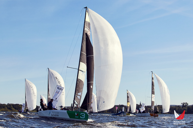 Załoga PG Racing Politechniki Gdańskiej zwyciężyła w finałowej rundzie 1 Ligi, czym przypieczętowała wygraną w całym sezonie i powrót do Ekstraklasy. Awans do najwyższej serii rozgrywek wywalczyły także kolejne w rankingu WKS Flota Gdynia, YKP Warszawa i KW Garland. Ligę opuściło 5 załóg, a ze strefy spadkowej dzięki sensacyjnemu wynikowi i podium w regatach wydostał się UKS Navigo. Sezon 1 Ligi Polskiej Ligi Żeglarskiej składał się z czterech rund – inauguracyjnej w Sopocie, a następnie w Gdyni, Pucku i finału w Szczecinie. Gospodarzem ostatniej rundy było Centrum Żeglarskie nad jeziorem Dąbie. Warunki wiatrowe dopisały, dzięki czemu komisji sędziowskiej w ciągu 2 dni udało się rozegrać aż 32 wyścigi, co stanowi rekord w historii Polskiej Ligi Żeglarskiej! Przed ostatecznym pojedynkiem niekwestionowanym faworytem do zwycięstwa była Politechnika Gdańska. Klubowi Młodzieżowi Mistrzowie Polski, ponownie prowadzeni przez Patryka Kosmalskiego, w tym sezonie postawili sobie za cel powrót do Ekstraklasy i ani razu nie ukończyli regat poza czołową piątką. Na ostatnią rundę poważne wzmocnienia poczyniła SLAVA Racing, do której dołączyła Lilly May Niezabitowska – Mistrzyni Europy U21 w olimpijskiej klasie ILCA 6 oraz Kacper Paszek – brązowy medalista mistrzostw świata juniorów i członek Kadry Narodowej PZŻ w klasie 470. Pierwszego dnia regat panowały idealne warunki pogodowe – słońce i stabilny, choć często zmieniający swój kierunek wiatr ze wschodu. Finałową rundę bardzo solidnie rozpoczęli faworyci z PG Racing, kończąc niemalże wszystkie wyścigi w czołowej piątce, co przy oscylacji kierunku wiatru nie było proste nawet dla najlepszych ekip. Na czele była także Flota Gdynia, świetny początek zaliczyły MAG Mechelinki, natomiast absolutną niespodzianką okazała się być dyspozycja UKS Navigo. Załogę z Sopotu na pozycji trymera grota przed regatami wzmocnił Bartosz Andrzejak, medalista mistrzostw Polski w klasie ILCA i to okazało się strzałem w dziesiątkę! Ekipa, która jeszcze przed finałową rundą znajdowała się głęboko w strefie spadkowej, zupełnie odmieniła swoje żeglowanie i po pierwszym dniu zajmowała drugie miejsce. Pozostałe załogi ze strefy spadkowej nie poprawiały swoich wyników, a problemy miały też YKP Warszawa i KW Garland, które walczyły o awans z dobrze żeglującymi ekipami PRO NAUTIS i wzmocnioną SLAVA Racing. Foto: Bartosz Modelski Drugiego dnia regat faworyci dalej nie zawodzili, natomiast ciekawie działo się na granicy strefy awansu – podobnie jak pierwszego dnia po nieudanych trzech pierwszych wyścigach, na sterze YKP Warszawa znalazł się Igor Tarasiuk, Klubowy Mistrz Polski 2023, który dotychczas żeglował na pozycji trymera grota. Zmiana pozwoliła im na odrobienie strat i uratowanie awansu, zwłaszcza wobec gorszej postawy w drugim dniu Garlandu oraz PRO NAUTIS i Mechelinek, które słabymi wynikami same utrudniały sobie walkę o promocję. Coraz lepiej żeglowała natomiast Slava Racing, niemalże doprowadzając do sensacji i wyprzedzenia KW Garland. Ostatecznie po wyścigu finałowym z udziałem najlepszych 9 załóg Politechnika dowiozła prowadzenie do samego końca, drugie miejsce zdobyła Flota, a na najniższym podium stanęło UKS Navigo, które utrzymało formę z pierwszego dnia regat. Wyniki 4. rundy 1 Ligi Polskiej Ligi Żeglarskiej, 25-27.09 Szczecin: